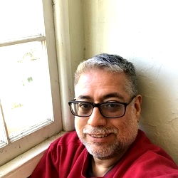 John Alabeacub, 45, Male. A man with glasses and a beard, leaning against a window. He's wearing a red shirt and has a calm expression on his face.