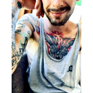 A tattooed man sits in front of an out-of-focus background, smiling subtly. He sports multiple tattoos on his arms, particularly noticeable are those on his forearm. His attire consists of a simple gray tank top. This image gives off a relaxed and casual vibe.