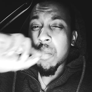 Close-up image of a man with beard, appearing to be in his early thirties. He is looking at the camera with a focused gaze and holding an object near his face. The focus is on his upper body and he appears relaxed. In the background, there is a blurred scene that looks like an urban environment, possibly at night, as suggested by the darkness.