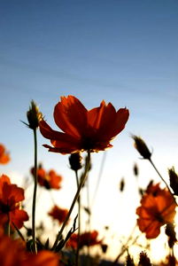 A serene image of a field of vibrant orange flowers against the backdrop of a warm sunset. The flowers cast delicate shadows on the ground, creating a peaceful and inviting scene.