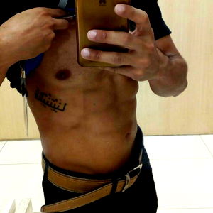 Shirtless man with a visible tattoo showcasing his workout routine. He holds a smartphone, possibly capturing his progress or sharing his fitness journey with followers.