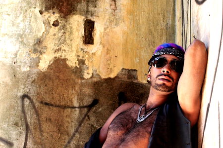 The model is posing with an urban, edgy vibe. He's wearing colorful clothing and glasses, leaning casually against a wall. The background suggests a street or urban environment.