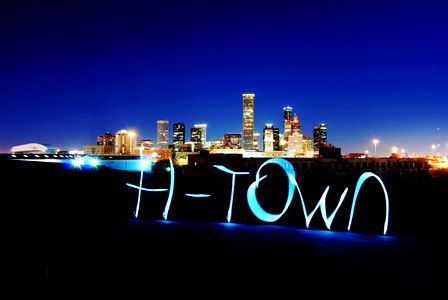 A captivating night-time shot of the Houston skyline, featuring the city's name written in lights on a pier. The photo encapsulates the essence of urban life and its vibrancy under the night sky.