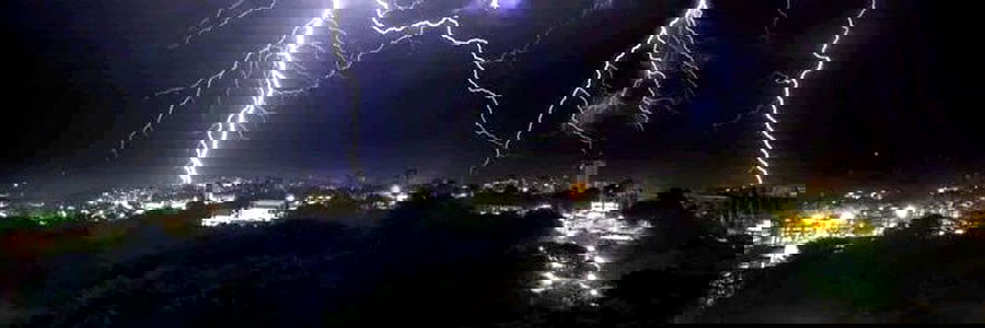 A dramatic nighttime shot capturing the raw power of a lightning storm over a cityscape, with Supermen as the model.