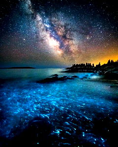 Experience the ethereal beauty of the night sky, with the Milky Way galaxy, star trails and a surreal blue lake, all set against the tranquil sea shore. A breathtaking moment captured in this stunning image.