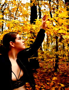 Alayna, an OnlyFans model, is seen walking through the woods. She's wearing a red bikini that contrasts with the autumn colors around her. The forest floor is covered in fallen leaves, adding to the serene and slightly eerie atmosphere of the image.