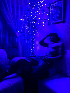 Alberich is a young adult captured in a serene setting. He's casually dressed, sitting on a couch with blue lighting that gives the room a relaxing ambiance.