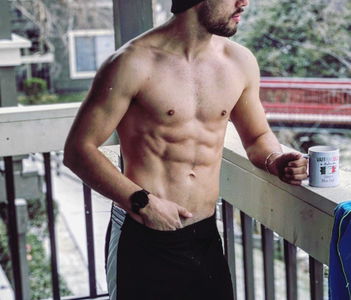 Albert Camus, a young adult male model, takes a moment to enjoy a drink on a balcony. He is shirtless, showcasing his toned physique and the intricate tattoo on his back. His relaxed posture suggests a sense of ease and confidence. The image captures him mid-sip, with one hand holding the cup and the other leaning casually against a railing. He seems to be looking off into the distance, adding a thoughtful quality to the scene. This photo showcases his modeling skills and athletic build.
