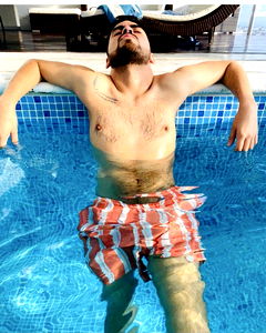 Anรญbal, a fitness enthusiast, enjoys some downtime by the pool. With his shirt off and a cool drink in hand, he embodies summer vibes.