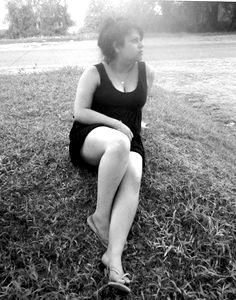Alyaro, a young woman with brown hair and striking pink lipstick. She is seated in front of a wooden wall, her gaze serious yet warm.