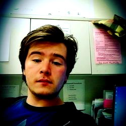 The image is of Alejandro Aguilera, a man in his early twenties. He appears to be in an office setting, seated at a desk. He has short, brown hair and a light skin tone. The photo is taken from the front and slightly to one side, capturing him mid-expression with a slight smile. Alejandro is wearing a casual T-shirt. The background shows typical office elements such as papers and other work-related items.