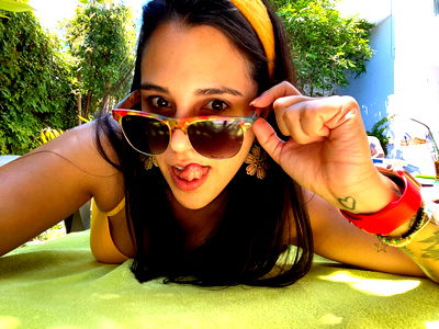 A young adult female in her mid-20s showcasing a playful and vibrant personality, with an expressive facial expression.