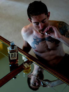 Photograph of Adam LeClaire, a fitness model and OnlyFans creator. In the image, he is sitting at a bar with his reflection in the glass table. He's holding a cigarette and gazing off to the side.