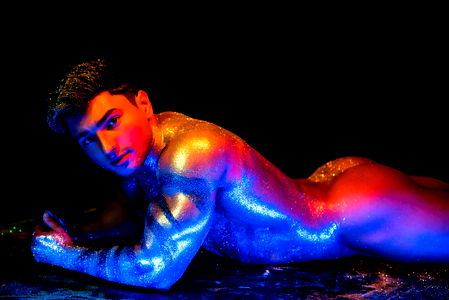 Alec Thomson is a model from Romania who is known for his vibrant photoshoots. In this particular image, he is seen in an intimate pose, surrounded by sparkling confetti and wearing glitter makeup on his face, arms, and chest. The photo captures the energy of the photoshoot and Alec's confident expression. The background is kept dark to make him stand out more.
