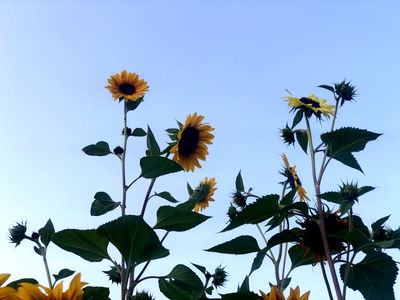 Vivid sunflowers blooming in a field, set against a clear sky.