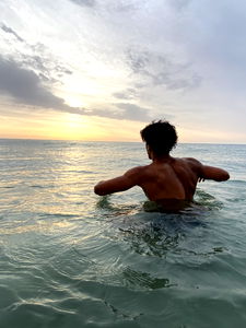 Fitness model Aleex Dvvl takes a moment to appreciate the view from the beachside cliff. His toned physique is accentuated by his casual yet athletic attire.