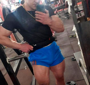 In this image, we see Aleeexxx_vega_@, a fitness influencer, standing in a well-equipped gym. He is dressed casually with a black t-shirt and blue shorts. The gym itself features various exercise equipment such as dumbbells and a bench. The ambient lighting in the gym highlights the muscular definition of Aleeexxx_vega_@, indicating his dedication to fitness. This photo seems to be from OnlyFans where he shares his workout routines and fitness journey with his fans.