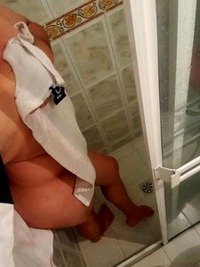 A candid and intimate photo of the Onlyfans model Ximena, captured in a personal moment. She is seen with an open shirt and a towel draped over her shoulder, possibly from a shower or bath. Her pose suggests a relaxed and comfortable environment, likely at home.