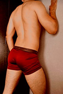 In this image, the OnlyFans model Alejandro confidently poses against a wall. He is dressed in red underwear and has his hands on his hips, exuding an air of confidence. His pose suggests that he is comfortable in front of the camera and enjoys presenting himself to his audience.