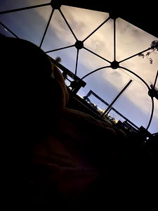 In the image, Alejandra Gomez is captured in a candid moment, sitting inside a tent at night. The mood appears peaceful and serene as she gazes out through the tent's window, possibly lost in thought or simply enjoying the tranquility of her surroundings. Her presence within the confines of the tent creates an intimate atmosphere, emphasizing her solitude.