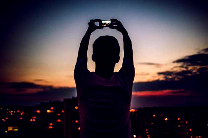 A person sits by a cityscape at sunset, silhouetted against the colorful sky. The scene evokes a sense of tranquility and introspection.