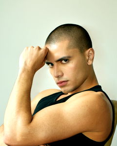 The image shows a model from Bogotรก named Alejandro posing for the camera. He is seated on a chair with his arm resting on the wall behind him, exuding a relaxed and confident demeanor. Dressed in a black tank top paired with blue jeans, his hairstyle and facial expressions add to his overall appearance.