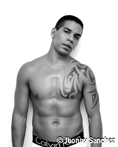 Celebrated for his sculpted physique and striking tattoos, Alex.R is a renowned fitness model from Spain. He showcases his toned abs and muscular form in this black-and-white portrait.