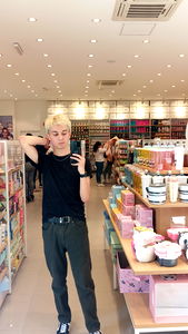 Alejandro, a young adult male with blonde hair and dark clothing, is standing inside a shop filled with various items. He seems to be posing for the camera with a neutral expression on his face.