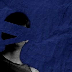 An abstract portrait with a blue background and a figure that appears to be a young adult male with partial face visibility. The image features an overlaid graphic resembling a shield or mask, which adds a mysterious and dramatic element to the composition.
