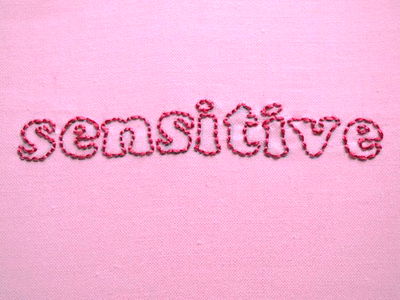 Handcrafted embroidered word 'sensitive' in pink stitched onto fabric background. A craft or art piece with a meaningful message. Ideal as a gift for someone who appreciates positive and gentle vibes.