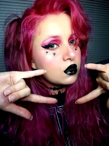Alekto, the Florida-based OnlyFans model, showcases her pop punk fashion sense in this image. She pairs her black lipstick and colorful eyeshadow with pink hair, adding a touch of flair to her outfit. Her makeup is meticulously applied, emphasizing her youthful yet confident persona.