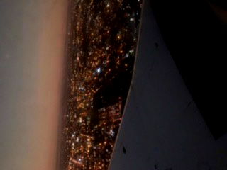 Panoramic perspective from an airplane window overlooking a metropolis at dusk. The sky transitions from shades of pink to darker blues, indicating the time of day. Below, urban structures are silhouetted against the fading light. This image is taken during a flight with the window seat.