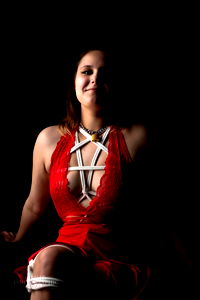 Alena exudes a blend of strength and sensuality in her red dress and suspender set, striking an alluring pose. Her unique style and confident expression are sure to captivate any viewer.