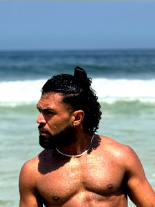 Alenflix is a Sรฃo Paulo-based model showcasing his athletic build on a beach backdrop. He strikes a confident pose in swim trunks, embodying summer vibes.