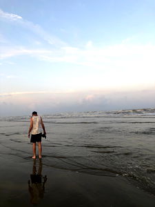 This image features a shirtless man sitting on a beach chair. He has short hair, appears to be middle-aged, and is wearing sunglasses and patterned swim shorts. The man has visible chest hair and is looking directly at the camera with a neutral expression.