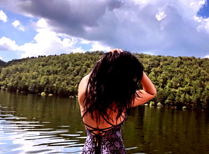 The image captures a serene moment of the Instagram-famous model Sandra Cristina, known for her risquรฉ and sultry photoshoots. In this particular photograph, she is seen reclining on a wooden dock next to a tranquil body of water. Her attire, a sleek black swimsuit, adds to the allure of the scene.