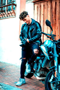 Alessandro Vanni, a young, fashionable model from Bogotรก, Colombia, is seen exuding confidence. He wears a black leather jacket, paired with a casual t-shirt, reflecting the edgy streetwear aesthetic.