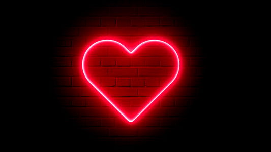 A neon heart sign, possibly symbolizing love or affection, placed against a brick wall with a black background. It is illuminated and stands out prominently. The sign is a simple yet striking feature.