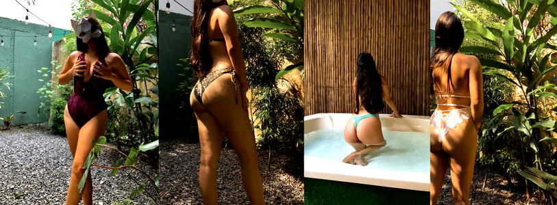 The image features Alessia the Lynx, a model and OnlyFans content creator, in a bikini against a tropical backdrop. She is striking a pose that accentuates her physique. The background showcases plants and a brick wall, adding to the exotic atmosphere of the scene.