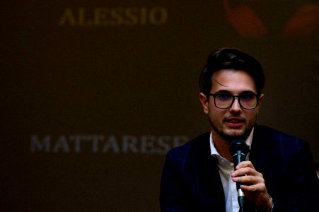 In this image, we see Alessio Mattarese, a young Italian man with glasses, standing at a microphone and delivering what appears to be an impassioned speech or presentation. His attire suggests a formal occasion, possibly related to his field of work or expertise. The background is minimalistic, placing the focus entirely on him and his message.
