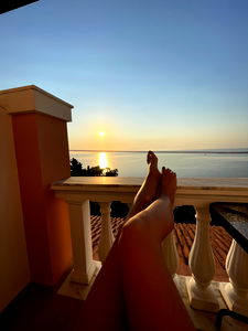 Enjoy the tranquil ambiance of Ale's balcony, overlooking a serene sunset and ocean view. Relax with a drink or simply take in the beauty of nature.