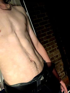 This is a split image of a shirtless man with a tattoo. He appears to be in his mid-twenties and has short hair. The image on the left is a standard selfie, while the one on the right seems to have been digitally altered to give him abs. He is looking directly at the camera with a slight smile.