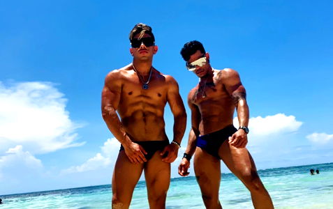 Alex Leal and an unnamed male fitness model pose confidently in beach attire, showcasing their physiques. A clear blue sky forms a picturesque backdrop.