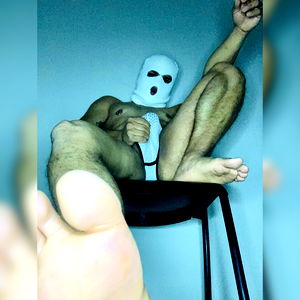 A sensual scene of OnlyFans model Chico on Fire, sitting on a bar stool with his legs crossed. Wearing a mask and showing off for the camera, this image is sure to catch your attention.