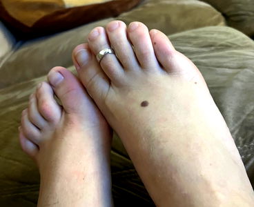 A pair of bare feet resting comfortably on a couch, with one wearing a toe ring. The feet are positioned parallel to each other, displaying neatly trimmed nails and smooth soles.