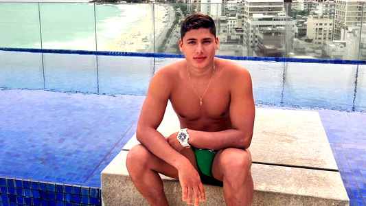 Alex, a professional swimmer from Colombia, takes a break to show off his physique and the cityscape in the background. He's in a poolside resort, wearing only swim trunks. A watch can be seen on his wrist.