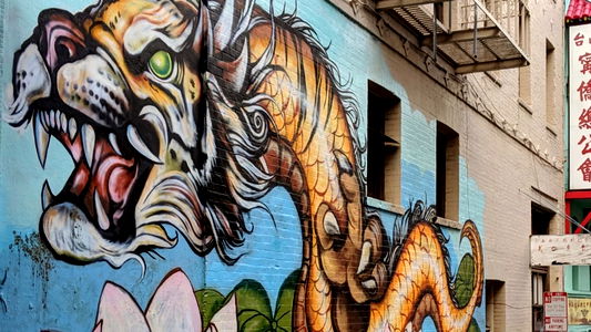 This image showcases a vibrant piece of graffiti art on a building wall. The artwork features a fierce tiger with a detailed mane and an open-mouthed expression, giving it a dynamic and lively appearance. The artist has skillfully used colors to bring the tiger to life, creating a captivating visual effect. The tiger is also depicted holding what appears to be a banner or flag with Chinese characters on it. This piece of art adds a splash of color and creativity to the urban landscape.