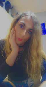 A woman is seen in a selfie, dressed casually. She has long brown hair and striking makeup, including dark lipstick. Her expression is neutral, and she is looking directly at the camera. The background appears to be indoors, possibly a home setting.