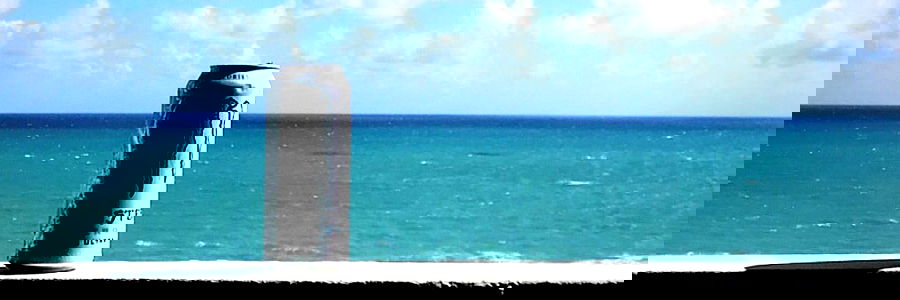 A peaceful beach scene with an ocean view. A solitary beer can is placed on the railing overlooking the turquoise waters. This could be a relaxing vacation spot or a serene setting for photography.