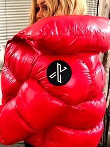 Alexa G, a popular fashion blogger based in the UK, is seen sporting her red Moncler puffer jacket. The image captures her confidently posing for the camera, highlighting the vibrant color and design of the jacket.